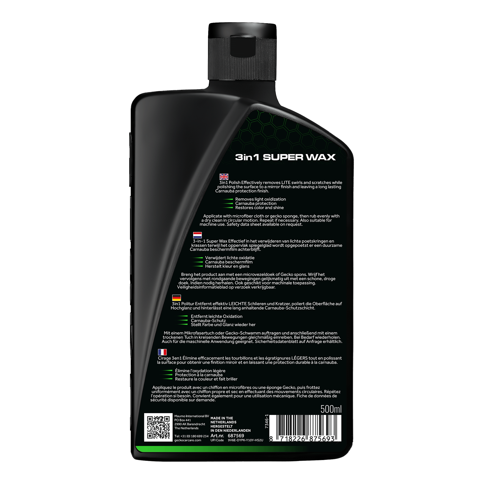 Gecko 3in1 Super Wax met carnauba is effectief in het verwijderen van lichte poetskringen en krassen, terwijl het oppervlak spiegelglad wordt opgepoetst er een duurzame Carnauba beschermfilm achterblijft. Gecko 3in1 polish + carnauba is geschikt voor het verwijderen van lichte oxidatie en zorgt voor kleur- en glansherstel. Het laat een dunne Carnaubafilm achter, waardoor de auto is beschermd tegen weersinvloeden. Vuil, regen en zand stroomt hiermee makkelijk van de auto af en hecht zich niet aan de lak.