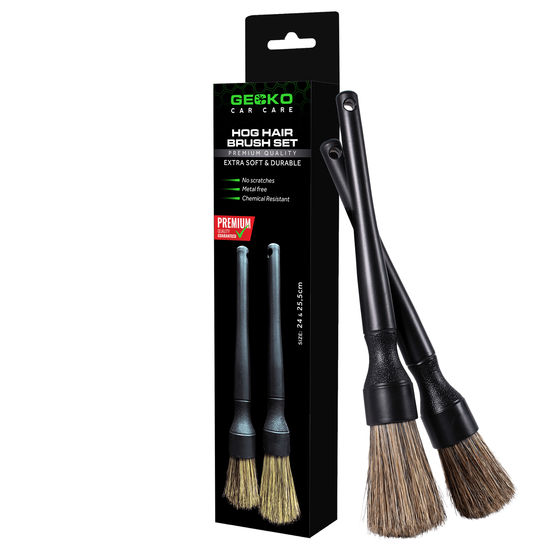 De Gecko Hog Hair Detailing Brush Set is onmisbaar voor het reinigen van lastig bereikbare delen van je voertuig, zoals remklauwen, velgen, ventilatieroosters en zelfs de kleinste kieren tussen panelen. Dankzij de stevige, natuurlijke zwijnenharen dringt de borstel moeiteloos door in kiertjes en naden, zodat je werkelijk elk detail kunt reinigen – van dashboard en motorruimte tot raamrubbers.