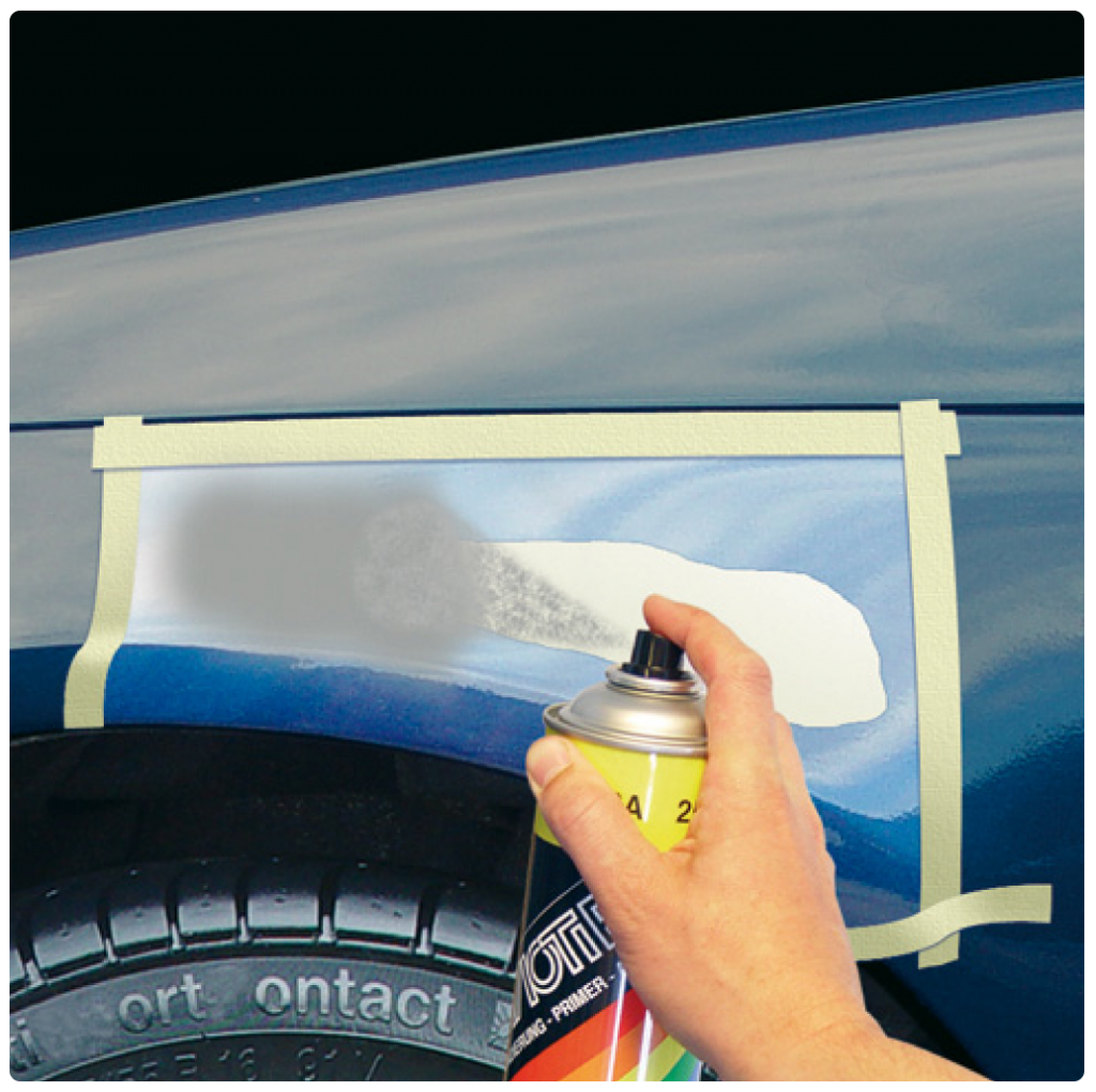 U dekt de omgeving af en brengt de primer aan in meerdere lagen. Na uitharding schuurt u de plek met korrel 1000.